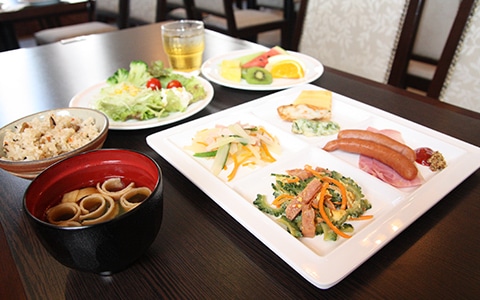 沖縄の郷土料理であるチャンプルーや沖縄そばをはじめとした、スタンダードな洋食や日替わり料理を楽しめる朝食もご好評いただいております。