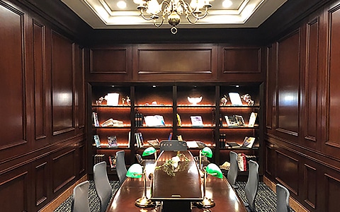 クラシックとモダンが融合した歴史を感じる木目の大きな本棚が印象的なビジネスルーム。高速インターネットを完備しております。