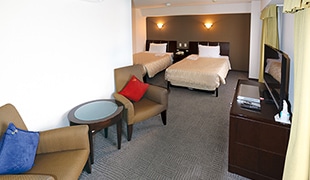 | 部屋設備 | 液晶テレビ、内線電話(外線はご利用頂けません)、冷房/暖房、浴槽、 冷蔵庫、湯沸しポット、電気スタンド、ライティングデスク、ドライヤー、温水式シャワートイレ、インターネット接続、消臭スプレー、シャンプー、コンディショナー、ボディーソープ、ハブラシ、T字レザー、ヘアブラシ、ルームウェア、ハンガー、グラス、マグカップ、スリッパ、靴ベラ、バスタオル、フェイスタオル、枕 |