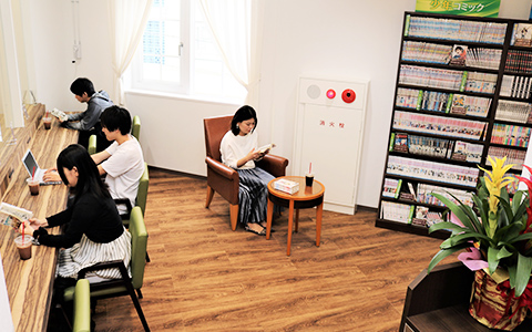 2Fのラウンジには書籍コーナーを設置。専門家がセレクトした書籍や約1000冊のコミックをご用意。