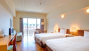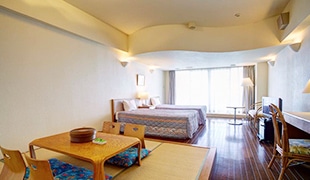 ツインルームに和室が併設された和洋室。和室ではお布団をご利用いただき、小さなお子様のいらっしゃるご家族も安心してお寛ぎいただけます。
