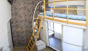 ロフト式ベッドの完全個室。お部屋の天井高はなんと約4m天井が高いので広く感じます。