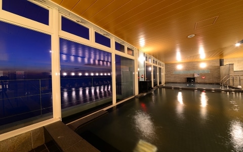 開放感あふれる展望浴場。ゆったりとお湯につかりながら朝日に輝く青い海、黄金色に輝く沈む夕陽をご家族でお楽しみください。