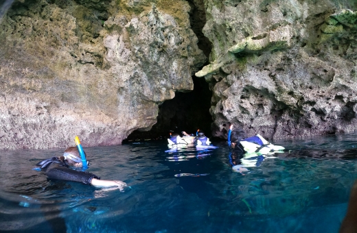 沖縄県恩納村にある人気スポット「青の洞窟」でシュノーケリング体験。ピンクマーリンクラブではインストラクターが浮き輪を持って同行しますので安心・安全にシュノーケリングを楽しむことができます。 -